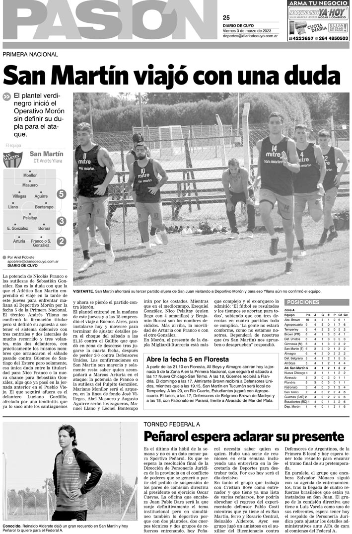 Diario de Cuyo | HOME | Noticias Tapa Pasión 03 de Marzo del 2023 Por Redacción Diario de Cuyo 02/03/2023 · 0:00 Escuchar la noticia Escuchar la noticia Your browser doesn’t support HTML5 audio Ver los comentarios ›