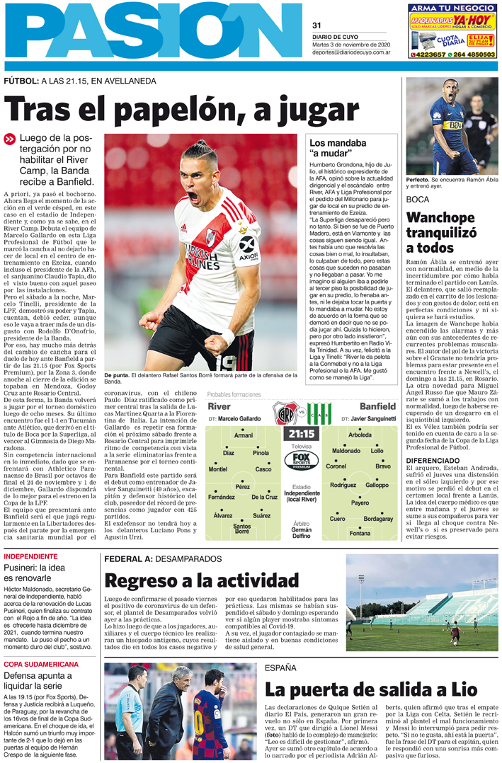 Diario de Cuyo | HOME | Noticias Tapa Pasión 03 de Noviembre del 2020 Por Redacción Diario de Cuyo 02/11/2020 · 0:00 Escuchar la noticia Escuchar la noticia Your browser doesn’t support HTML5 audio Ver los comentarios ›