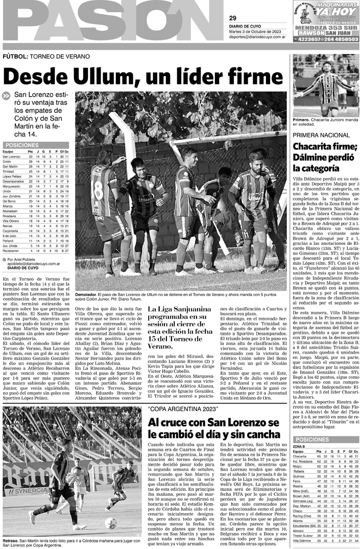 Diario de Cuyo | HOME | Noticias Tapa Pasión 03 de Octubre del 2023 Por Redacción Diario de Cuyo 02/10/2023 · 0:00 Escuchar la noticia Escuchar la noticia Your browser doesn’t support HTML5 audio Ver los comentarios ›