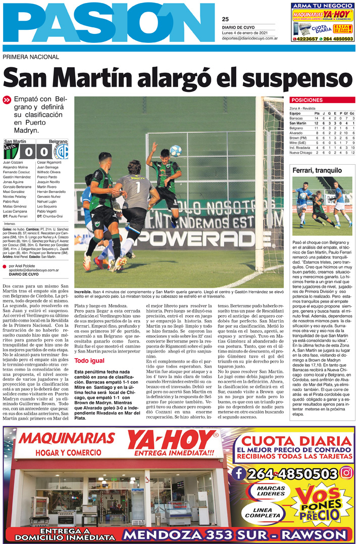 Diario de Cuyo | HOME | Noticias Tapa Pasión 04 de Enero del 2021 Por Redacción Diario de Cuyo 03/01/2021 · 0:00 Escuchar la noticia Escuchar la noticia Your browser doesn’t support HTML5 audio Ver los comentarios ›