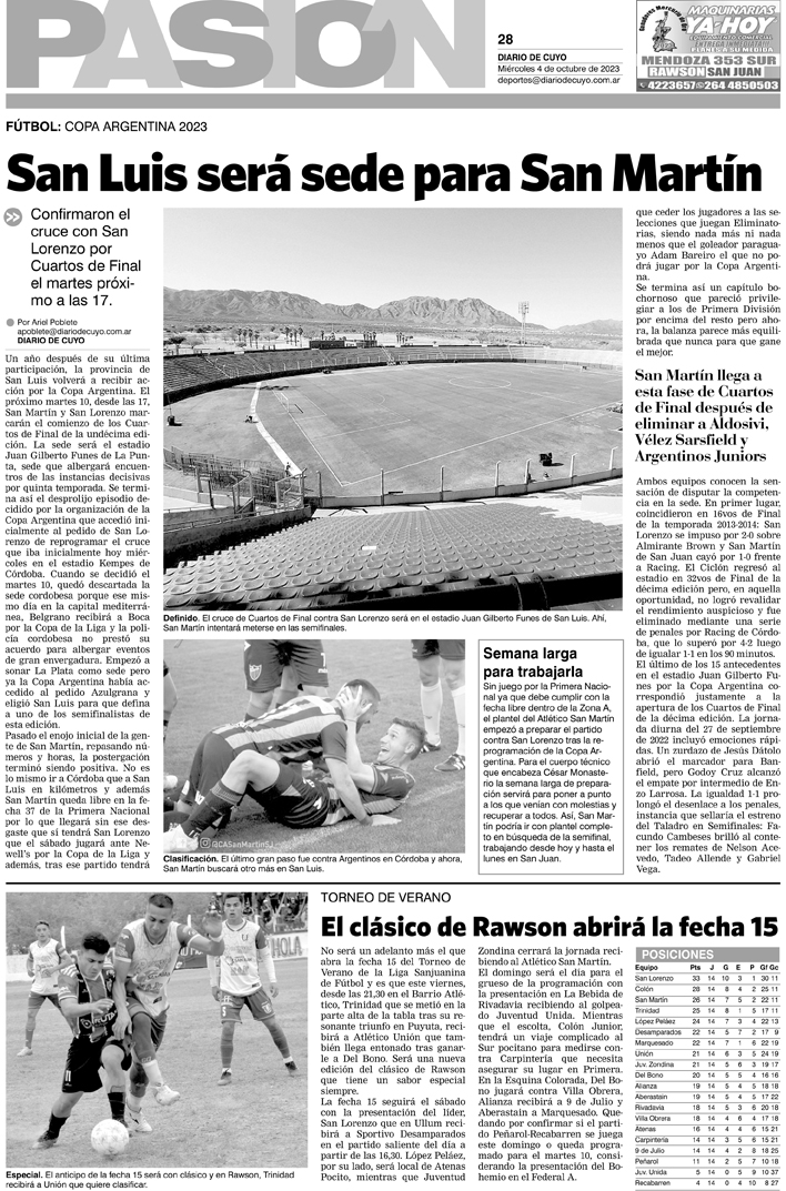 Diario de Cuyo | HOME | Noticias Tapa Pasión 04 de Octubre del 2023 Por Redacción Diario de Cuyo 03/10/2023 · 0:00 Escuchar la noticia Escuchar la noticia Your browser doesn’t support HTML5 audio Ver los comentarios ›