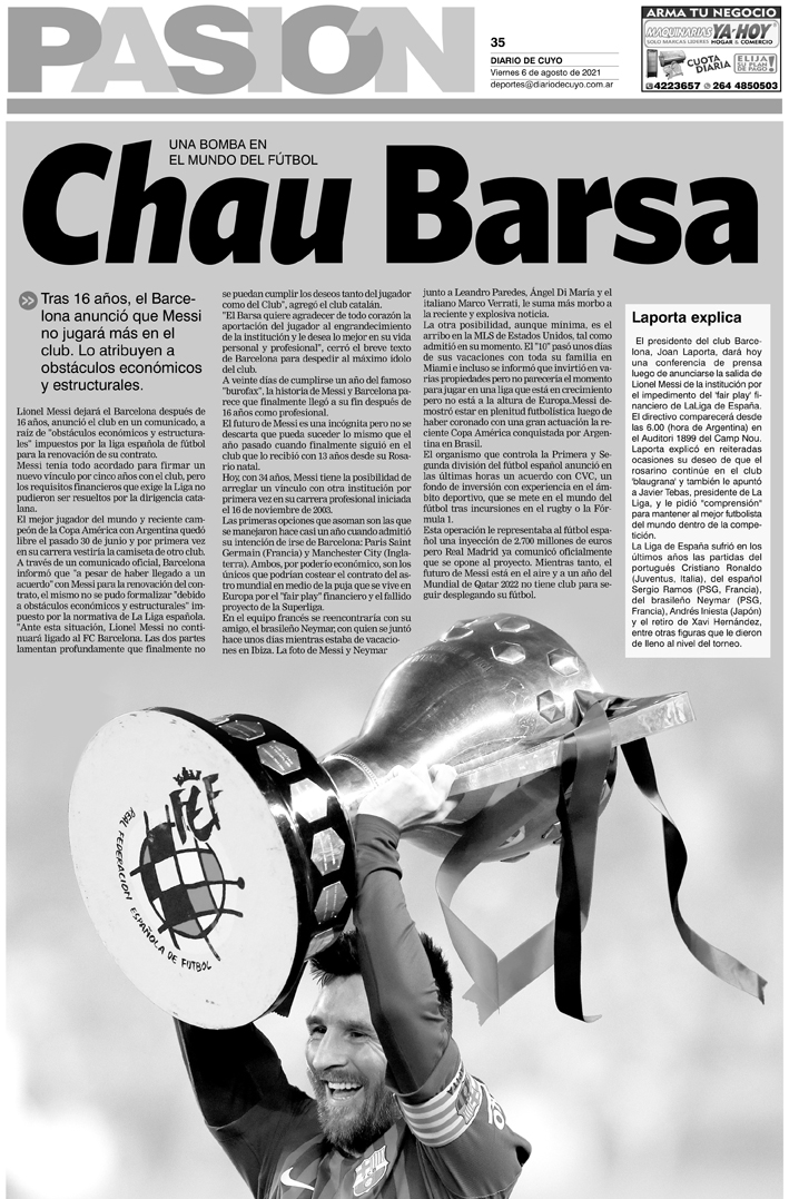 Diario de Cuyo | HOME | Noticias Tapa Pasión 06 de Agosto del 2021 Por Redacción Diario de Cuyo 05/08/2021 · 0:00 Escuchar la noticia Escuchar la noticia Your browser doesn’t support HTML5 audio Ver los comentarios ›