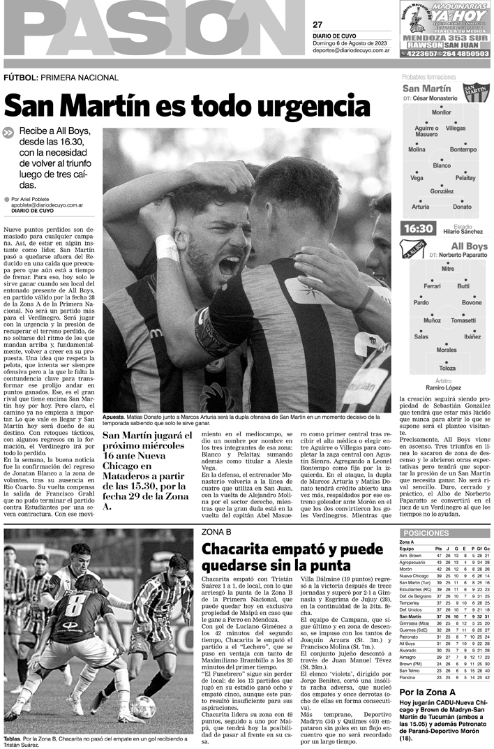 Diario de Cuyo | HOME | Noticias Tapa Pasión 06 de Agosto del 2023 Por Redacción Diario de Cuyo 06/08/2023 · 0:00 Escuchar la noticia Escuchar la noticia Your browser doesn’t support HTML5 audio Ver los comentarios ›