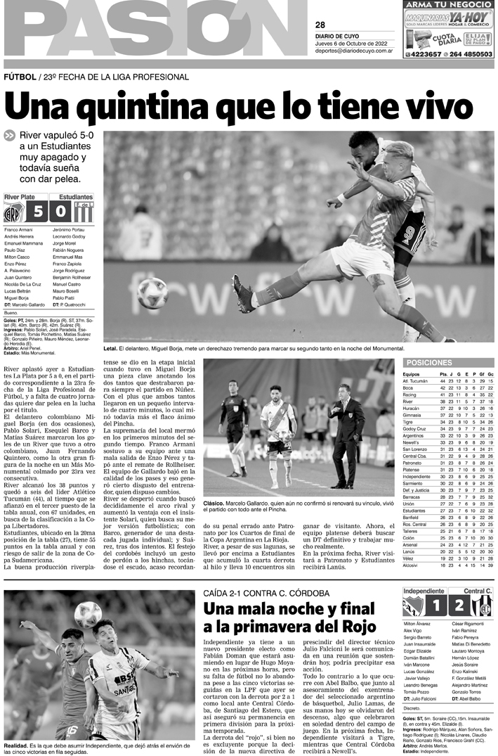 Diario de Cuyo | HOME | Noticias Tapa Pasión 06 de Octubre del 2022 Por Redacción Diario de Cuyo 06/10/2022 · 0:00 Escuchar la noticia Escuchar la noticia Your browser doesn’t support HTML5 audio Ver los comentarios ›