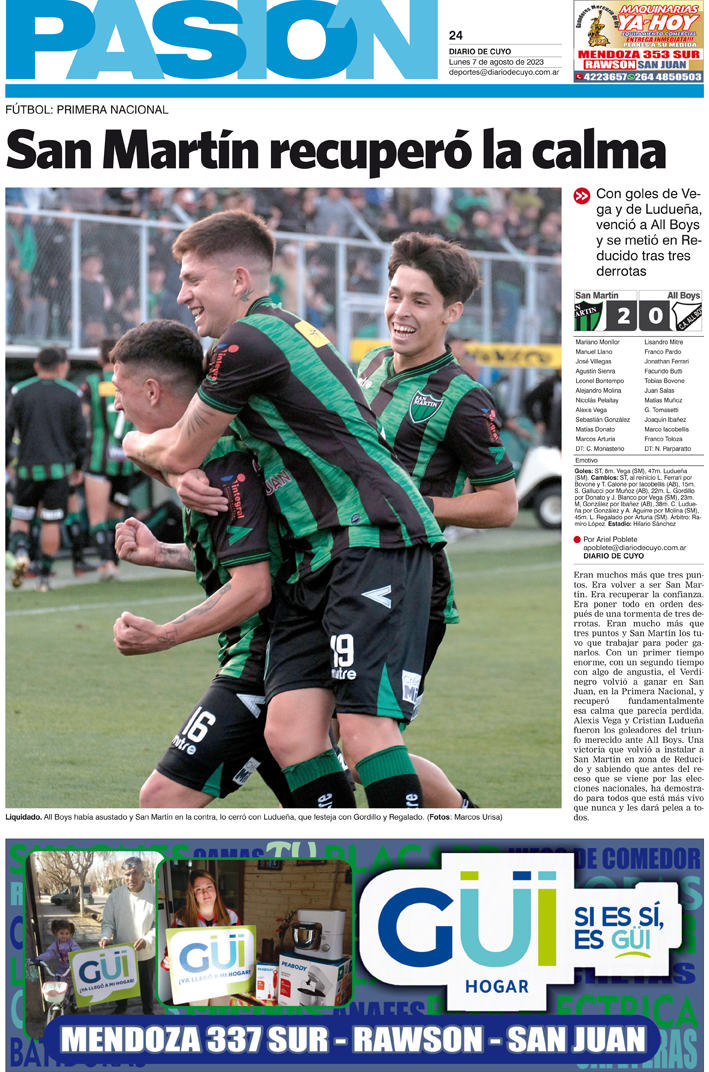 Diario de Cuyo | HOME | Noticias Tapa Pasión 07 de Agosto del 2023 Por Redacción Diario de Cuyo 06/08/2023 · 0:00 Escuchar la noticia Escuchar la noticia Your browser doesn’t support HTML5 audio Ver los comentarios ›