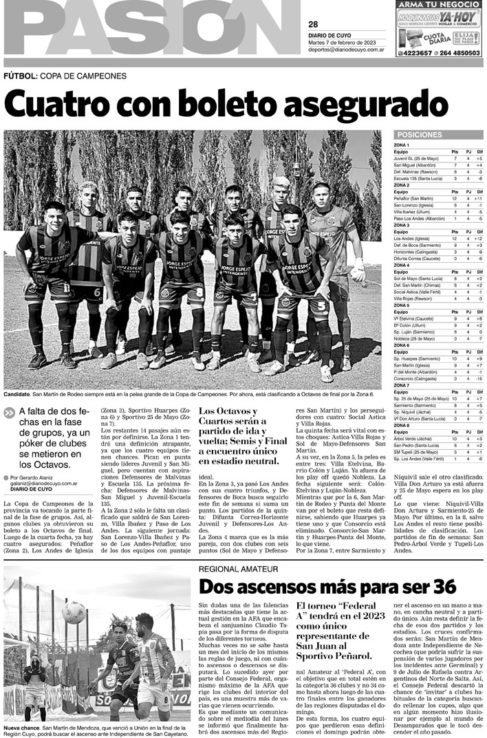 Diario de Cuyo | HOME | Noticias Tapa Pasión 07 de Febrero del 2023 Por Redacción Diario de Cuyo 06/02/2023 · 0:00 Escuchar la noticia Escuchar la noticia Your browser doesn’t support HTML5 audio Ver los comentarios ›