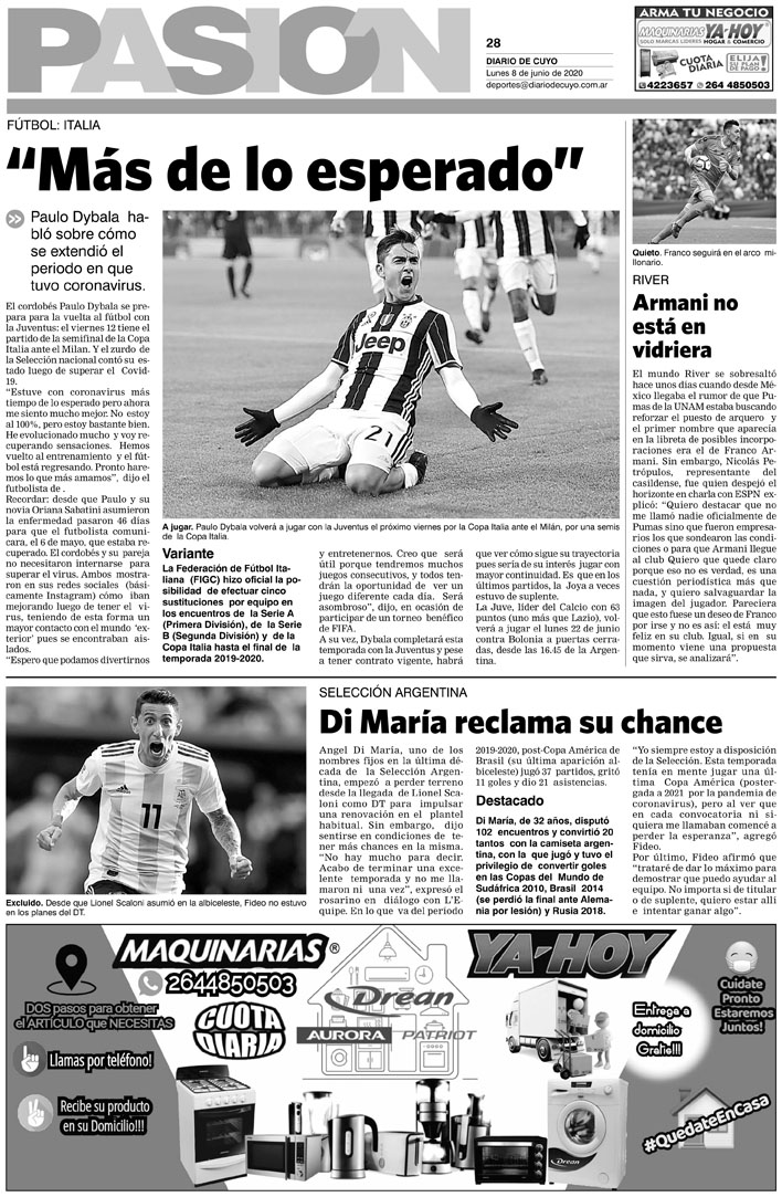 Diario de Cuyo | HOME | Noticias Tapa Pasión 08 de Junio del 2020 Por Redacción Diario de Cuyo 07/06/2020 · 0:00 Escuchar la noticia Escuchar la noticia Your browser doesn’t support HTML5 audio Ver los comentarios ›