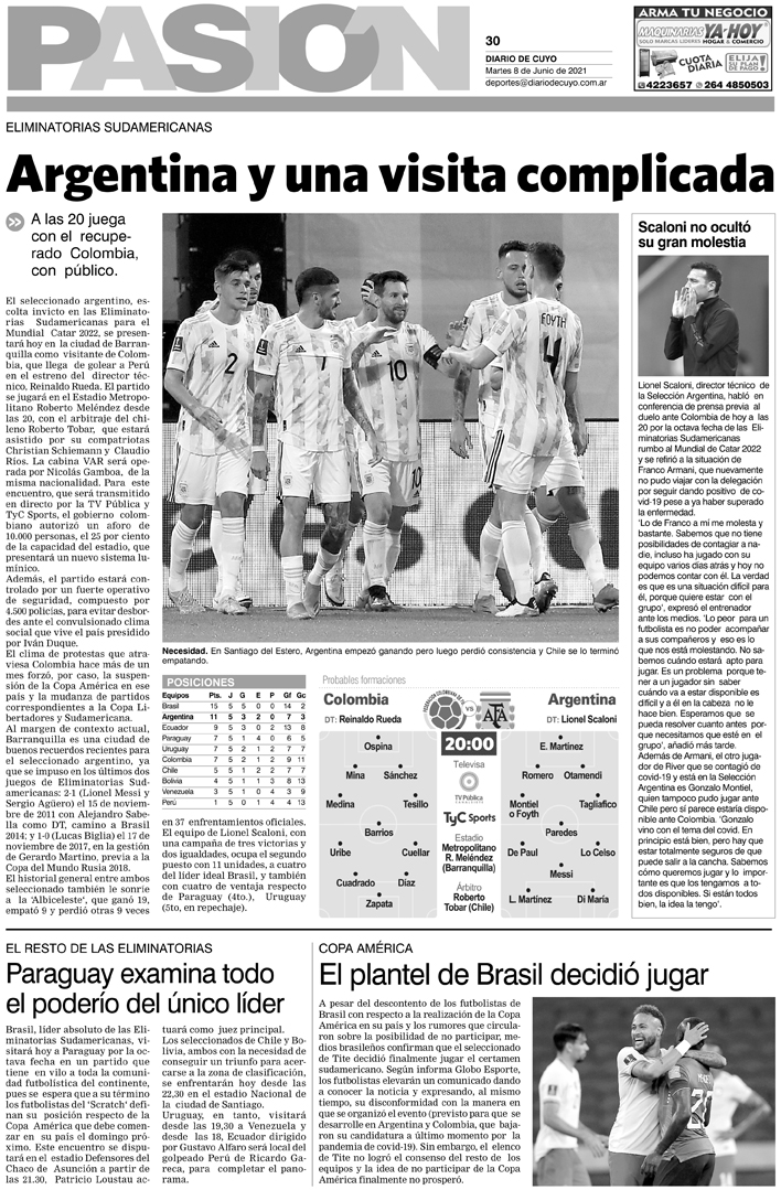 Diario de Cuyo | HOME | Noticias Tapa Pasión 08 de Junio del 2021 Por Redacción Diario de Cuyo 07/06/2021 · 0:00 Escuchar la noticia Escuchar la noticia Your browser doesn’t support HTML5 audio Ver los comentarios ›