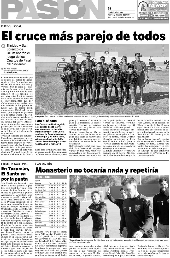 Diario de Cuyo | HOME | Noticias Tapa Pasión 08 de Junio del 2023 Por Redacción Diario de Cuyo 07/06/2023 · 0:00 Escuchar la noticia Escuchar la noticia Your browser doesn’t support HTML5 audio Ver los comentarios ›