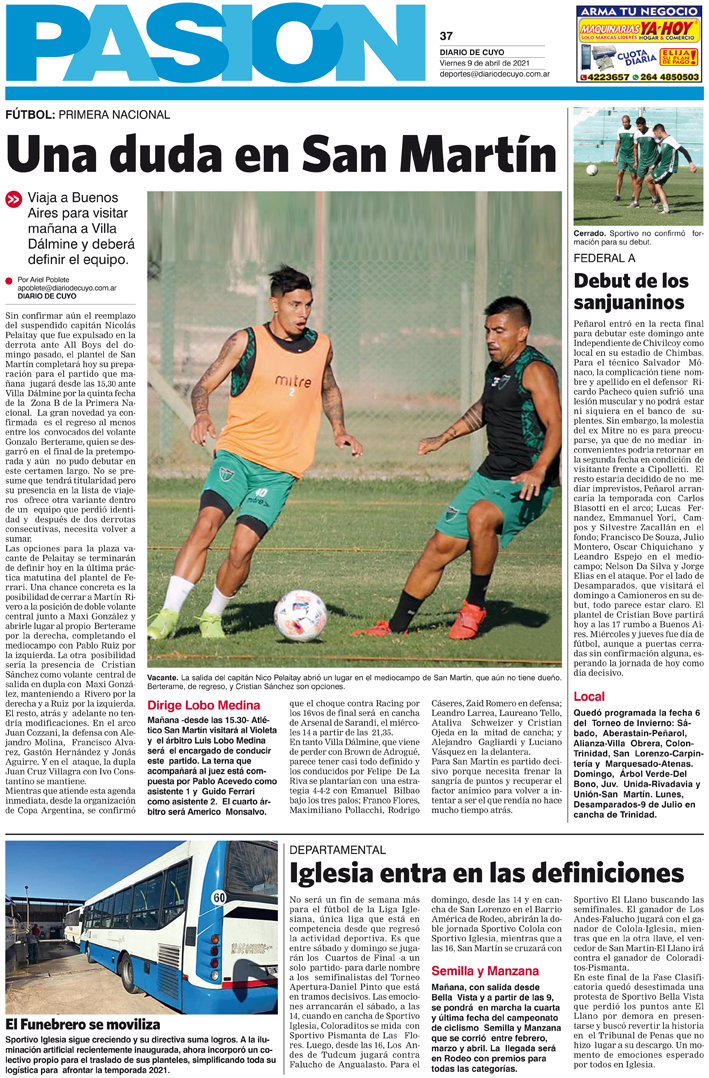 Diario de Cuyo | HOME | Noticias Tapa Pasión 09 de Abril del 2021 Por Redacción Diario de Cuyo 08/04/2021 · 0:00 Escuchar la noticia Escuchar la noticia Your browser doesn’t support HTML5 audio Ver los comentarios ›