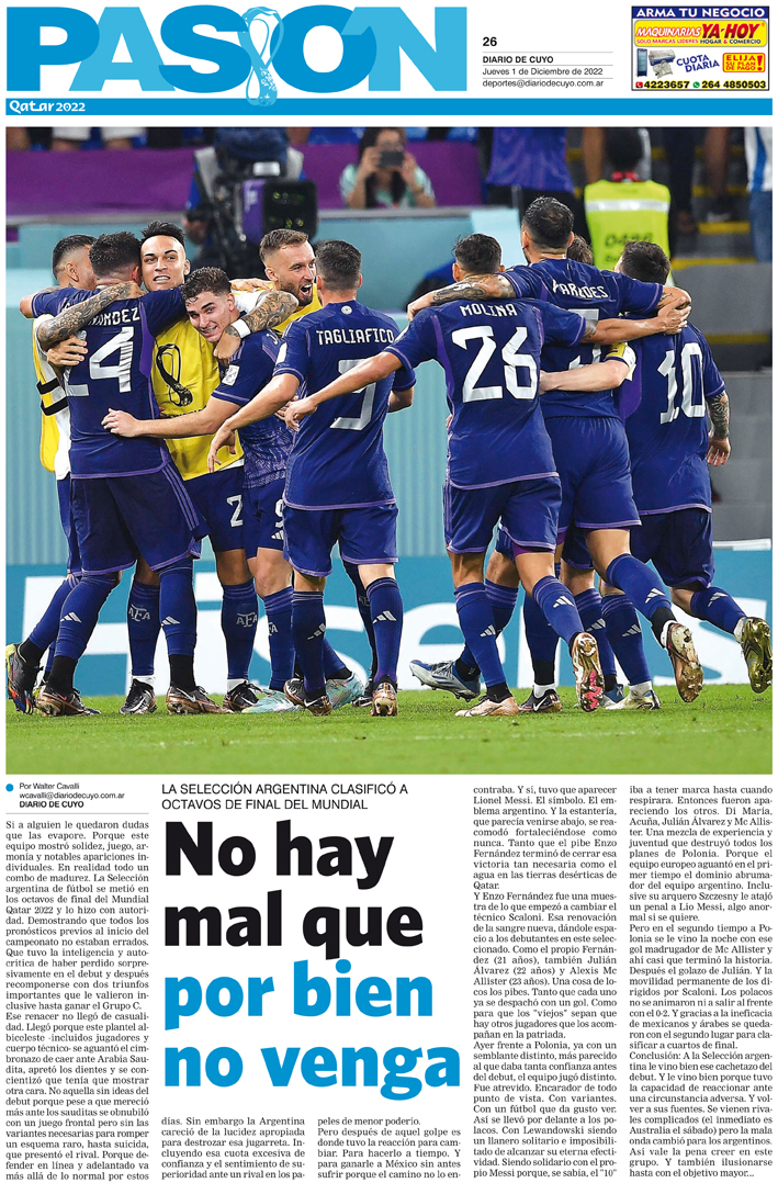 Diario de Cuyo | HOME | Noticias Tapa Pasión 1 de Diciembre del 2022 Por Redacción Diario de Cuyo 30/11/2022 · 0:00 Escuchar la noticia Escuchar la noticia Your browser doesn’t support HTML5 audio Ver los comentarios ›