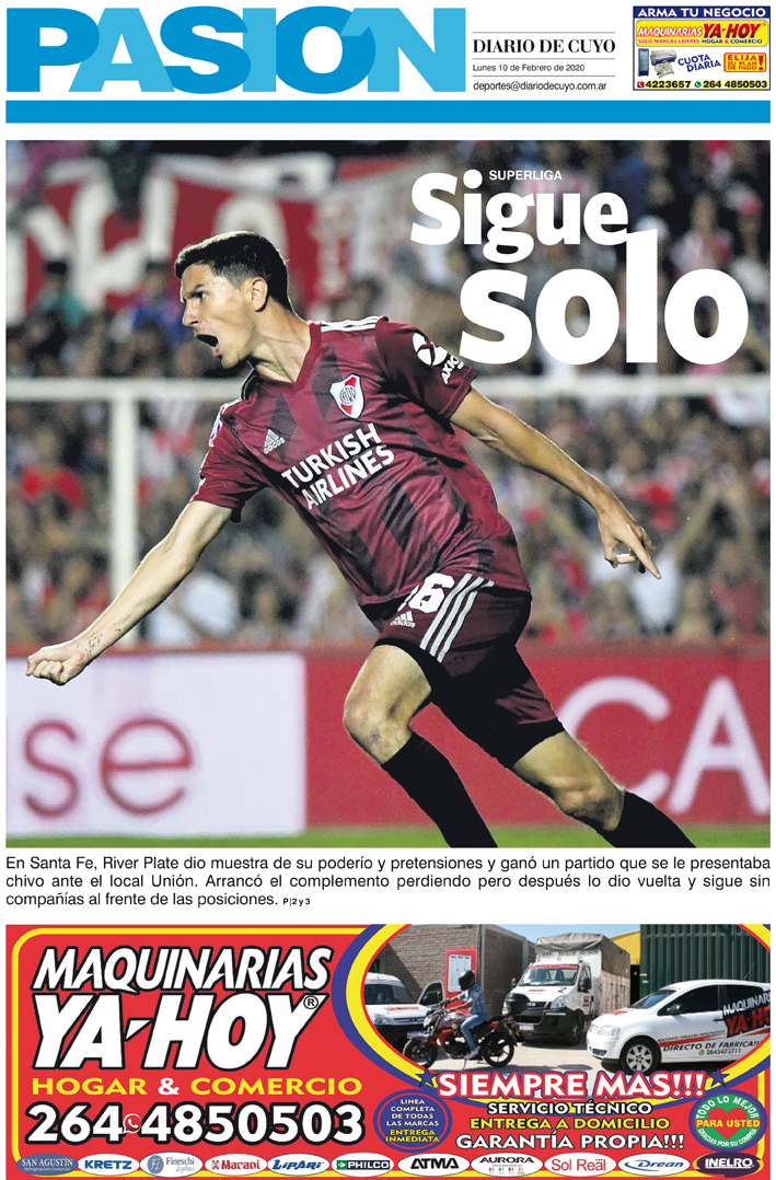 Diario de Cuyo | HOME | Noticias | Tapa Pasión Tapa Pasión 10 de Febrero de 2020 Por Redacción Diario de Cuyo 10/02/2020 · 0:00 Escuchar la noticia Escuchar la noticia Your browser doesn’t support HTML5 audio Tapa Pasión Ver los comentarios ›