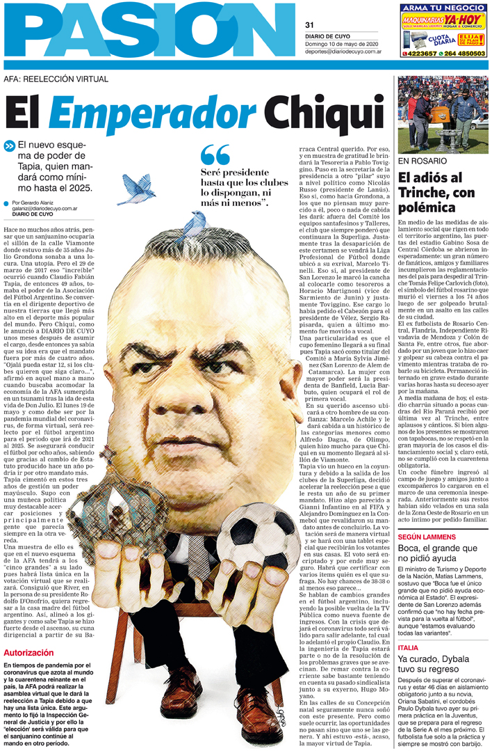 Diario de Cuyo | HOME | Noticias | Tapa Pasión Tapa Pasión 10 de Mayo de 2020 Por Redacción Diario de Cuyo 09/05/2020 · 0:00 Escuchar la noticia Escuchar la noticia Your browser doesn’t support HTML5 audio Tapa Pasión Ver los comentarios ›