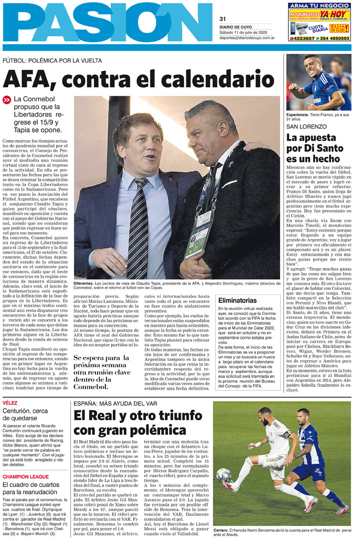 Diario de Cuyo | HOME | Noticias Tapa Pasión 11 de Julio del 2020 Por Redacción Diario de Cuyo 10/07/2020 · 0:00 Escuchar la noticia Escuchar la noticia Your browser doesn’t support HTML5 audio Ver los comentarios ›