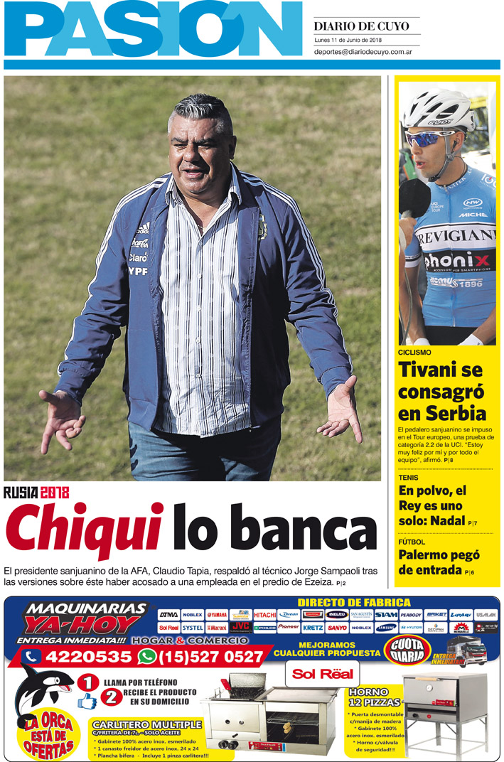 Diario de Cuyo | HOME | Noticias | Tapa Pasión Tapa Pasión 11 de Junio 2018 Por Redacción Diario de Cuyo 10/06/2018 · 0:00 Escuchar la noticia Escuchar la noticia Your browser doesn’t support HTML5 audio Tapa Pasión Ver los comentarios ›