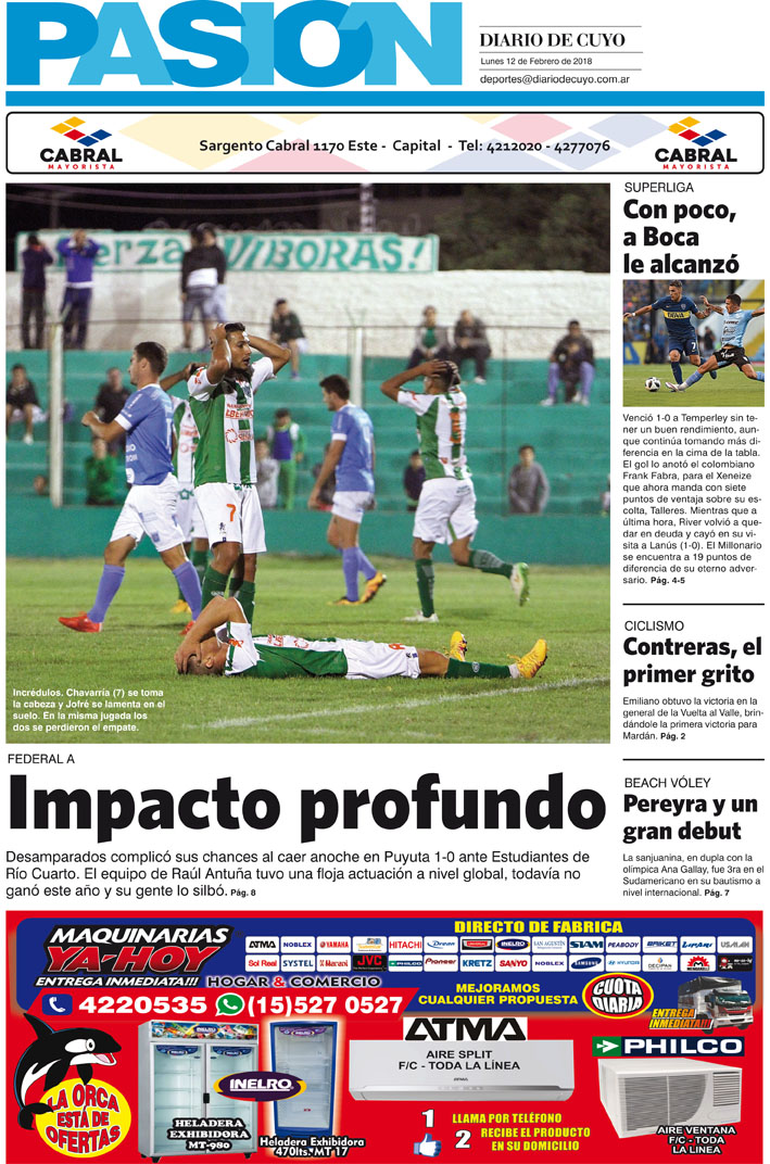 Diario de Cuyo | HOME | Noticias | Tapa Pasión Tapa Pasión 12 de Febrero del 2018 Por Redacción Diario de Cuyo 12/02/2018 · 0:00 Escuchar la noticia Escuchar la noticia Your browser doesn’t support HTML5 audio Tapa Pasión Ver los comentarios ›