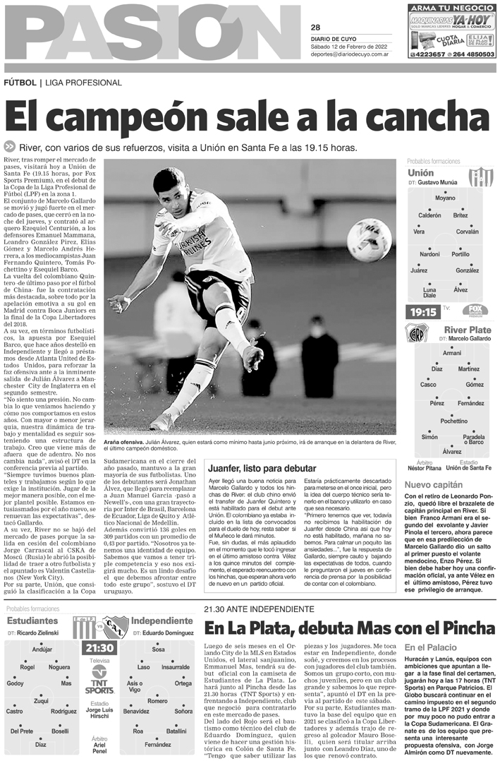 Diario de Cuyo | HOME | Noticias Tapa Pasión 12 de Febrero del 2022 Por Redacción Diario de Cuyo 11/02/2022 · 0:00 Escuchar la noticia Escuchar la noticia Your browser doesn’t support HTML5 audio Ver los comentarios ›