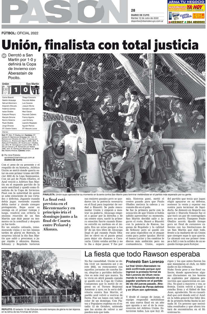 Diario de Cuyo | HOME | Noticias Tapa Pasión 12 de Julio del 2022 Por Redacción Diario de Cuyo 11/07/2022 · 0:00 Escuchar la noticia Escuchar la noticia Your browser doesn’t support HTML5 audio Ver los comentarios ›