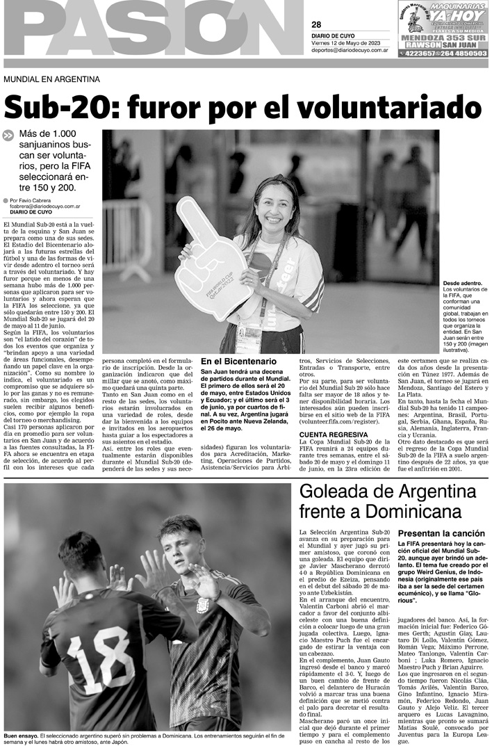 Diario de Cuyo | HOME | Noticias Tapa Pasión 12 de Mayo de 2023 Por Redacción Diario de Cuyo 11/05/2023 · 0:00 Escuchar la noticia Escuchar la noticia Your browser doesn’t support HTML5 audio Ver los comentarios ›