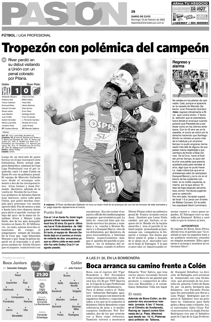 Diario de Cuyo | HOME | Noticias Tapa Pasión 13 de Febrero del 2022 Por Redacción Diario de Cuyo 12/02/2022 · 0:00 Escuchar la noticia Escuchar la noticia Your browser doesn’t support HTML5 audio Ver los comentarios ›