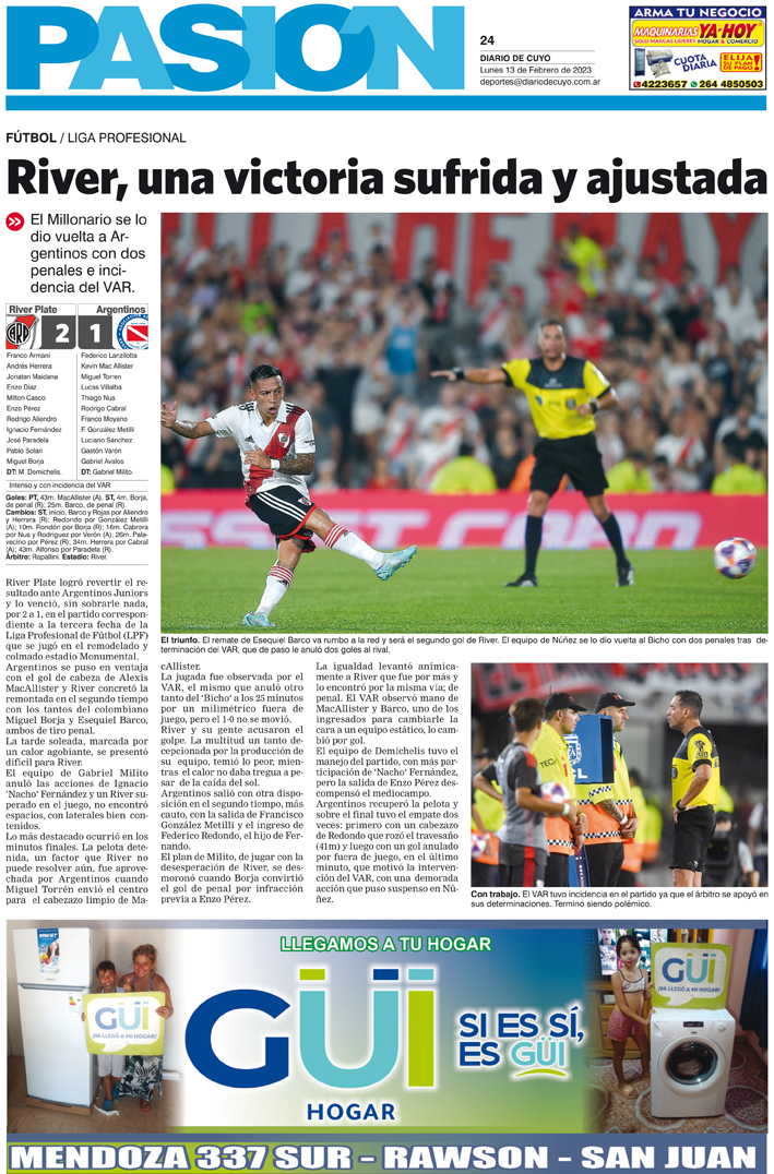 Diario de Cuyo | HOME | Noticias Tapa Pasión 13 de Febrero del 2023 Por Redacción Diario de Cuyo 13/02/2023 · 0:00 Escuchar la noticia Escuchar la noticia Your browser doesn’t support HTML5 audio Ver los comentarios ›
