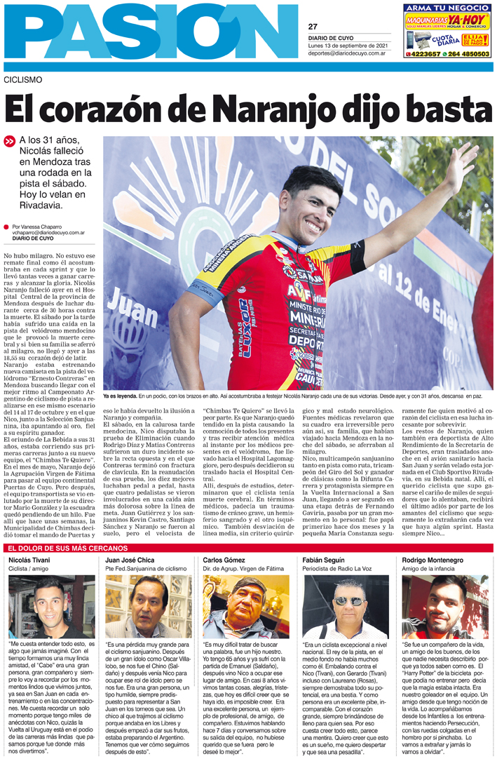 Diario de Cuyo | HOME | Noticias Tapa Pasión 13 de Septiembre del 2021 Por Redacción Diario de Cuyo 12/09/2021 · 0:00 Escuchar la noticia Escuchar la noticia Your browser doesn’t support HTML5 audio Ver los comentarios ›