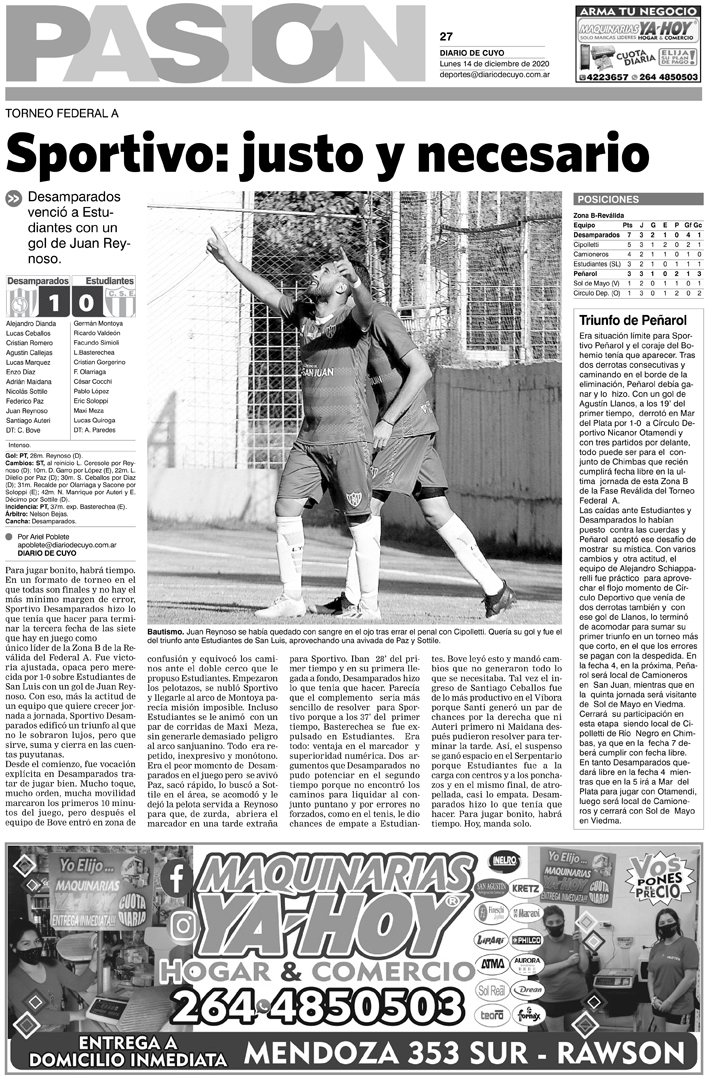 Diario de Cuyo | HOME | Noticias Tapa Pasión 14 de diciembre del 2020 Por Redacción Diario de Cuyo 13/12/2020 · 0:00 Escuchar la noticia Escuchar la noticia Your browser doesn’t support HTML5 audio Ver los comentarios ›