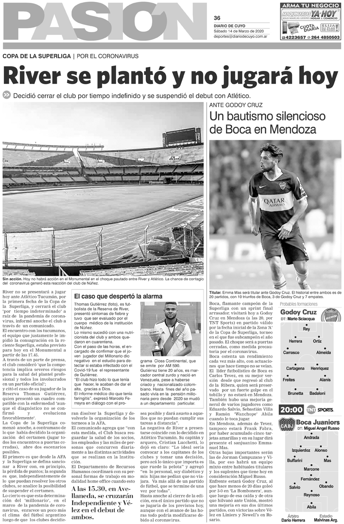 Diario de Cuyo | HOME | Noticias | Tapa Pasión Tapa Pasión 14 de Marzo de 2020 Por Redacción Diario de Cuyo 13/03/2020 · 0:00 Escuchar la noticia Escuchar la noticia Your browser doesn’t support HTML5 audio Tapa Pasión Ver los comentarios ›
