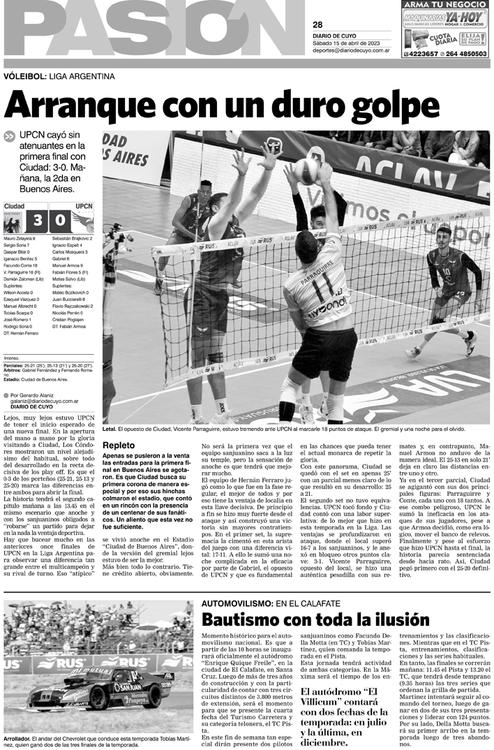Diario de Cuyo | HOME | Noticias Tapa Pasión 15 de Abril de 2023 Por Redacción Diario de Cuyo 14/04/2023 · 0:00 Escuchar la noticia Escuchar la noticia Your browser doesn’t support HTML5 audio Ver los comentarios ›