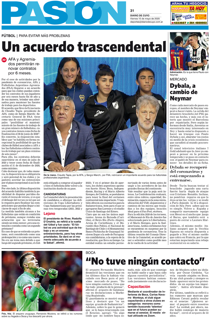 Diario de Cuyo | HOME | Noticias | Tapa Pasión Tapa Pasión 15 de Mayo de 2020 Por Redacción Diario de Cuyo 14/05/2020 · 0:00 Escuchar la noticia Escuchar la noticia Your browser doesn’t support HTML5 audio Tapa Pasión Ver los comentarios ›