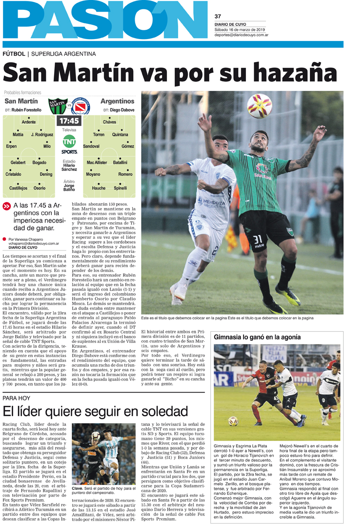 Diario de Cuyo | HOME | Noticias | Tapa Pasión Tapa Pasión 16 de Marzo 2019 Por Redacción Diario de Cuyo 16/03/2019 · 0:00 Escuchar la noticia Escuchar la noticia Your browser doesn’t support HTML5 audio Tapa Pasión Ver los comentarios ›