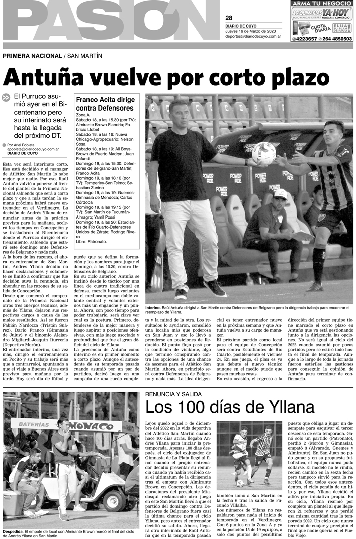 Diario de Cuyo | HOME | Noticias Tapa Pasión 16 de Marzo del 2023 Por Redacción Diario de Cuyo 15/03/2023 · 0:00 Escuchar la noticia Escuchar la noticia Your browser doesn’t support HTML5 audio Ver los comentarios ›