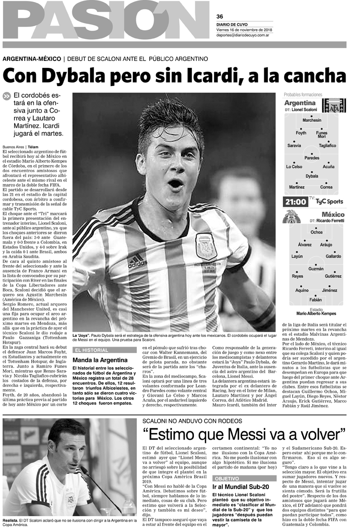 Diario de Cuyo | HOME | Noticias Tapa Pasión 16 de Noviembre 2018 Por Redacción Diario de Cuyo 16/11/2018 · 0:00 Escuchar la noticia Escuchar la noticia Your browser doesn’t support HTML5 audio Ver los comentarios ›