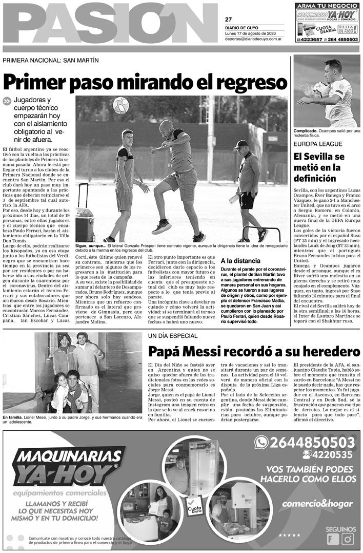 Diario de Cuyo | HOME | Noticias Tapa Pasión 17 de Agosto del 2020 Por Redacción Diario de Cuyo 16/08/2020 · 0:00 Escuchar la noticia Escuchar la noticia Your browser doesn’t support HTML5 audio Ver los comentarios ›
