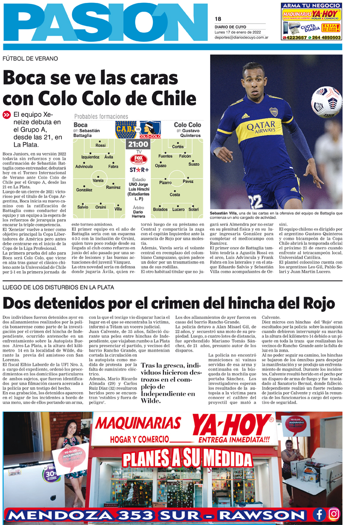 Diario de Cuyo | HOME | Noticias Tapa Pasión 17 de Enero del 2022 Por Redacción Diario de Cuyo 17/01/2022 · 0:00 Escuchar la noticia Escuchar la noticia Your browser doesn’t support HTML5 audio Ver los comentarios ›