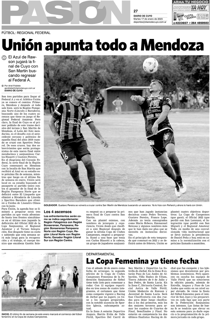 Diario de Cuyo | HOME | Noticias Tapa Pasión 17 de Enero del 2023 Por Redacción Diario de Cuyo 16/01/2023 · 0:00 Escuchar la noticia Escuchar la noticia Your browser doesn’t support HTML5 audio Ver los comentarios ›