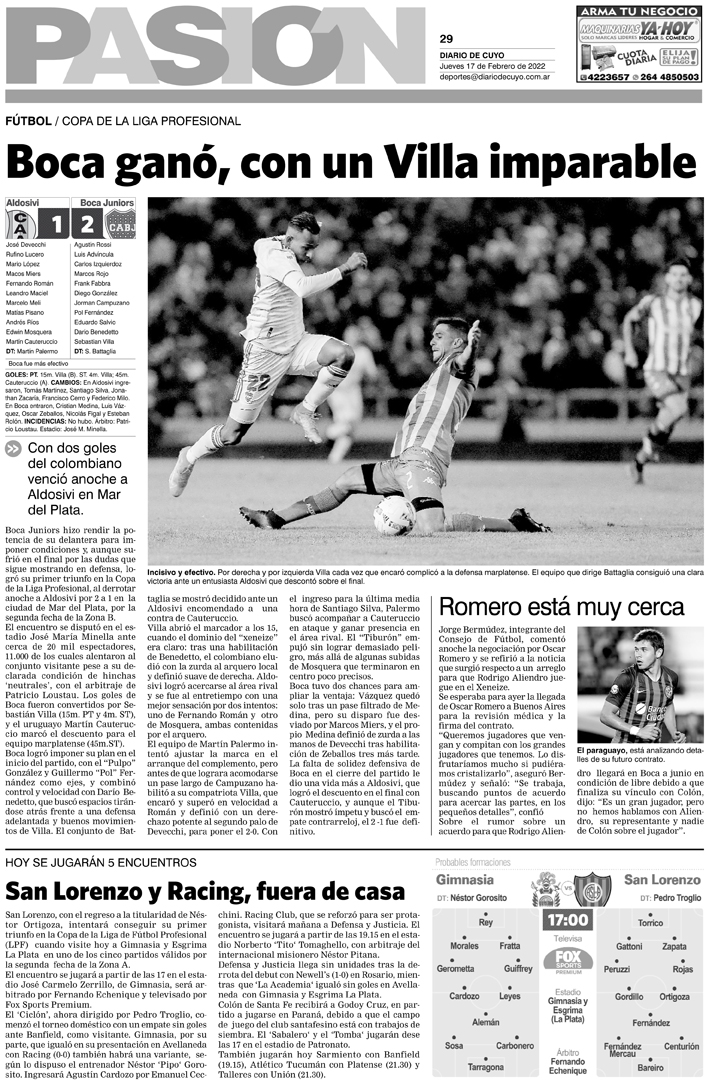 Diario de Cuyo | HOME | Noticias Tapa Pasión 17 de Febrero del 2022 Por Redacción Diario de Cuyo 17/02/2022 · 0:00 Escuchar la noticia Escuchar la noticia Your browser doesn’t support HTML5 audio Ver los comentarios ›