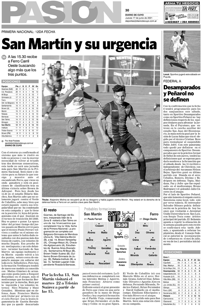 Diario de Cuyo | HOME | Noticias Tapa Pasión 17 de Junio del 2021 Por Redacción Diario de Cuyo 16/06/2021 · 0:00 Escuchar la noticia Escuchar la noticia Your browser doesn’t support HTML5 audio Ver los comentarios ›