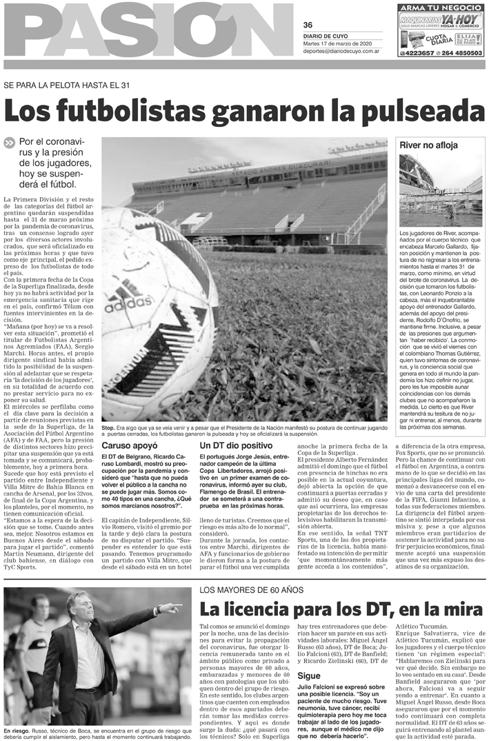 Diario de Cuyo | HOME | Noticias | Tapa Pasión Tapa Pasión 17 de Marzo de 2020 Por Redacción Diario de Cuyo 16/03/2020 · 0:00 Escuchar la noticia Escuchar la noticia Your browser doesn’t support HTML5 audio Tapa Pasión Ver los comentarios ›