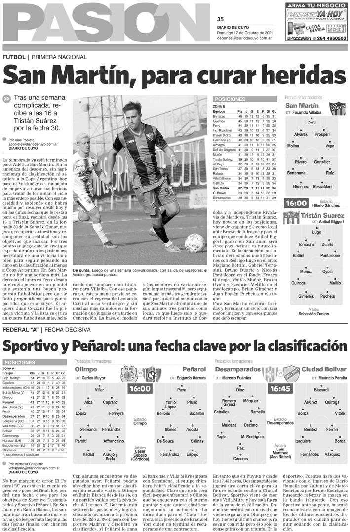 Diario de Cuyo | HOME | Noticias Tapa Pasión 17 de Octubre del 2021 Por Redacción Diario de Cuyo 16/10/2021 · 0:00 Escuchar la noticia Escuchar la noticia Your browser doesn’t support HTML5 audio Ver los comentarios ›