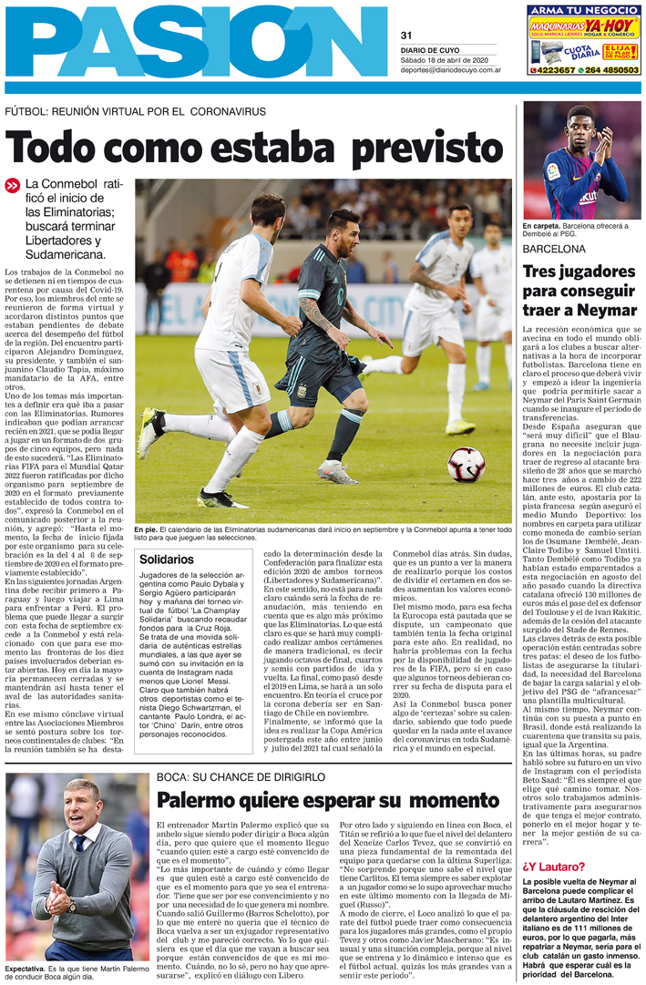 Diario de Cuyo | HOME | Noticias | Tapa Pasión Tapa Pasión 18 de Abril de 2020 Por Redacción Diario de Cuyo 17/04/2020 · 0:00 Escuchar la noticia Escuchar la noticia Your browser doesn’t support HTML5 audio Tapa Pasión Ver los comentarios ›