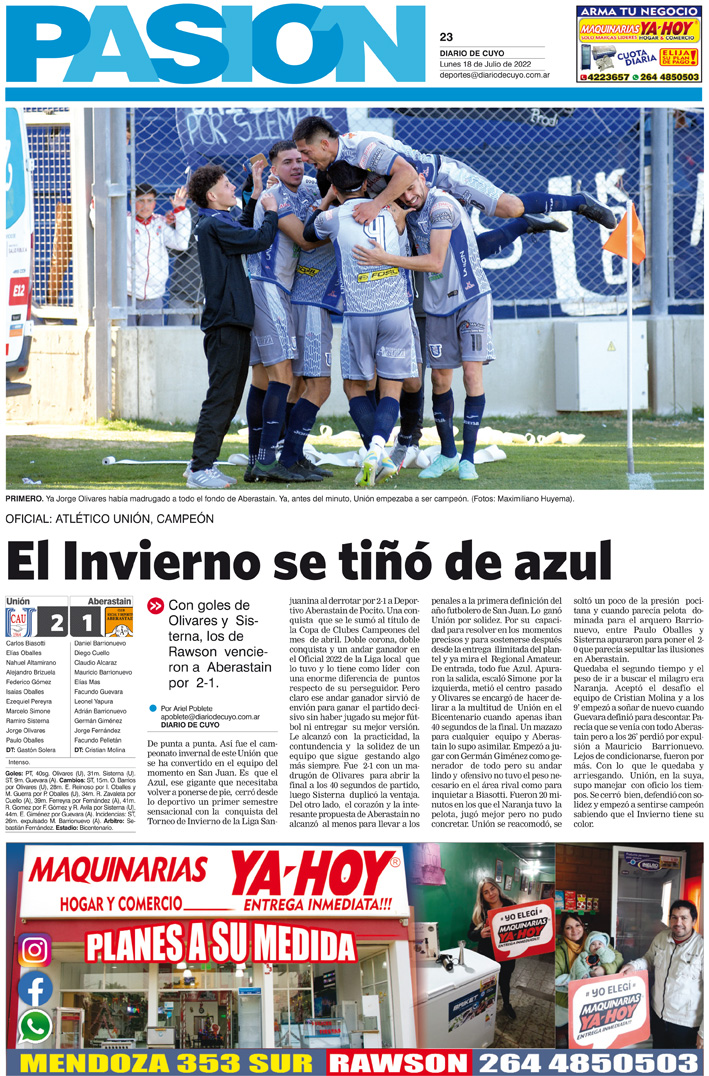 Diario de Cuyo | HOME | Noticias Tapa Pasión 18 de Julio del 2022 Por Redacción Diario de Cuyo 17/07/2022 · 0:00 Escuchar la noticia Escuchar la noticia Your browser doesn’t support HTML5 audio Ver los comentarios ›