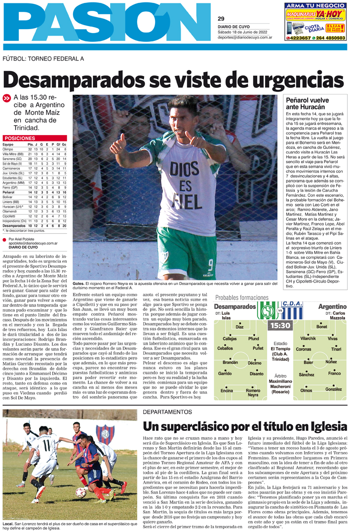 Diario de Cuyo | HOME | Noticias Tapa Pasión 18 de Junio del 2022 Por Redacción Diario de Cuyo 17/06/2022 · 0:00 Escuchar la noticia Escuchar la noticia Your browser doesn’t support HTML5 audio Ver los comentarios ›