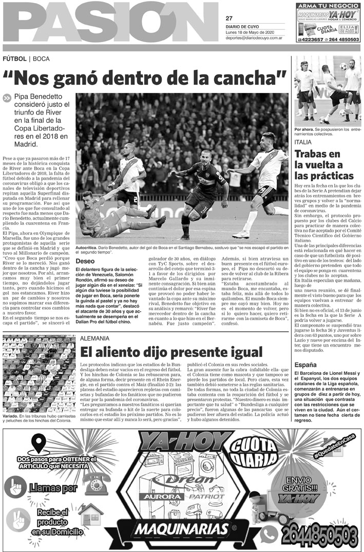 Diario de Cuyo | HOME | Noticias Tapa Pasión 18 de Mayo del 2020 Por Redacción Diario de Cuyo 17/05/2020 · 0:00 Escuchar la noticia Escuchar la noticia Your browser doesn’t support HTML5 audio Ver los comentarios ›