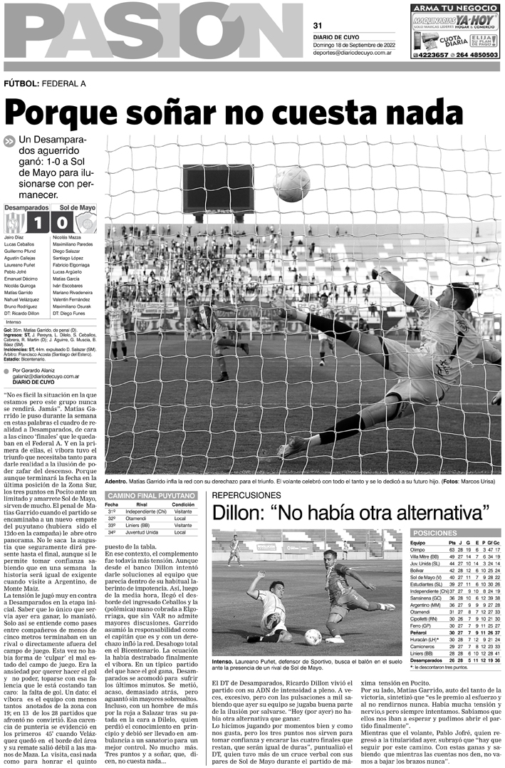Diario de Cuyo | HOME | Noticias Tapa Pasión 18 de Septiembre de 2022 Por Redacción Diario de Cuyo 17/09/2022 · 0:00 Escuchar la noticia Escuchar la noticia Your browser doesn’t support HTML5 audio Ver los comentarios ›