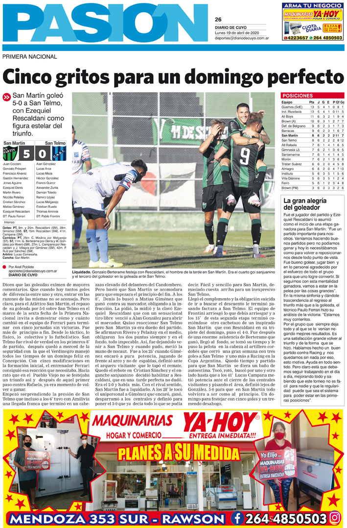 Diario de Cuyo | HOME | Noticias Tapa Pasión 19 de Abril del 2021 Por Redacción Diario de Cuyo 18/04/2021 · 0:00 Escuchar la noticia Escuchar la noticia Your browser doesn’t support HTML5 audio Ver los comentarios ›