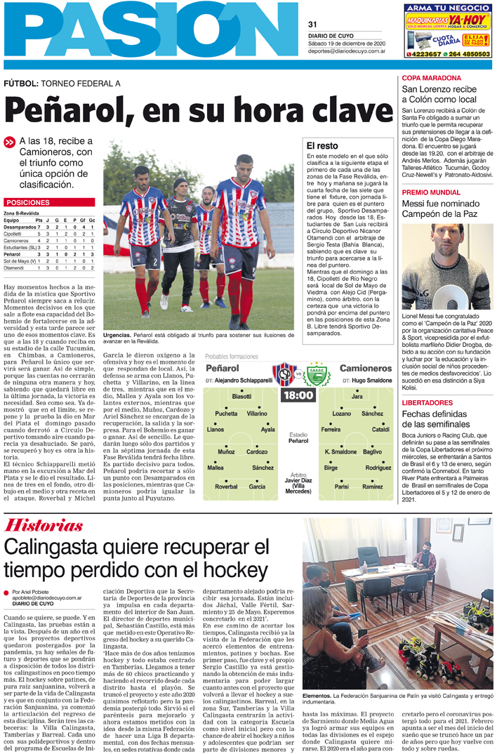Diario de Cuyo | HOME | Noticias Tapa Pasión 19 de Diciembre del 2020 Por Redacción Diario de Cuyo 18/12/2020 · 0:00 Escuchar la noticia Escuchar la noticia Your browser doesn’t support HTML5 audio Ver los comentarios ›