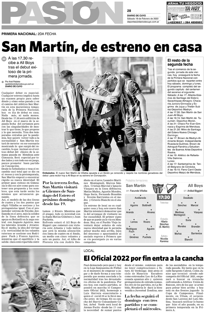 Diario de Cuyo | HOME | Noticias Tapa Pasión 19 de Febrero del 2022 Por Redacción Diario de Cuyo 18/02/2022 · 0:00 Escuchar la noticia Escuchar la noticia Your browser doesn’t support HTML5 audio Ver los comentarios ›