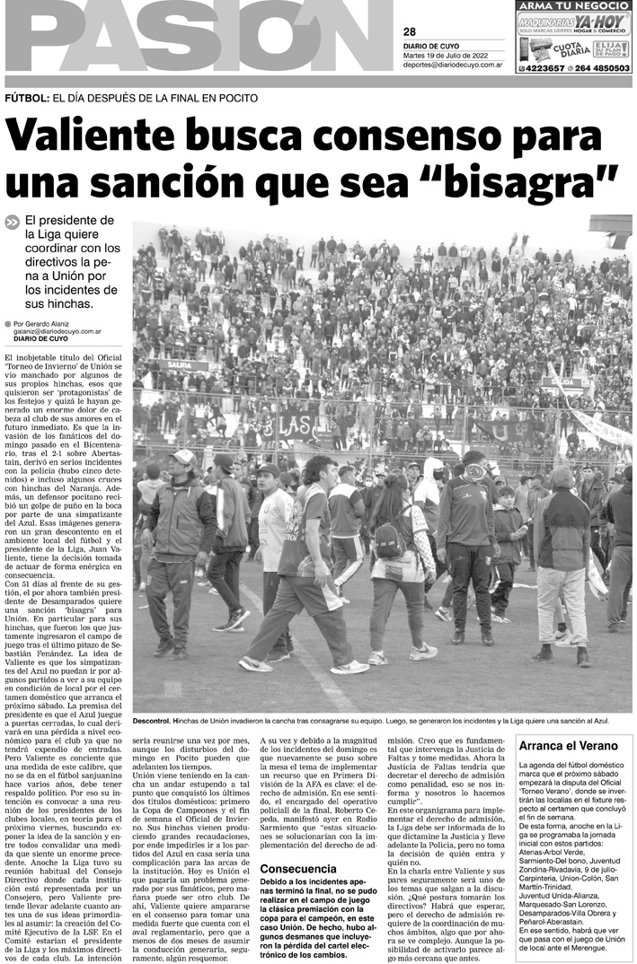 Diario de Cuyo | HOME | Noticias Tapa Pasión 19 de Julio del 2022 Por Redacción Diario de Cuyo 18/07/2022 · 0:00 Escuchar la noticia Escuchar la noticia Your browser doesn’t support HTML5 audio Ver los comentarios ›