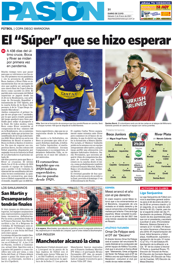 Diario de Cuyo | HOME | Noticias | Tapa Pasión Tapa Pasión 2 de Enero de 2021 Por Redacción Diario de Cuyo 01/01/2021 · 0:00 Escuchar la noticia Escuchar la noticia Your browser doesn’t support HTML5 audio Tapa Pasión Ver los comentarios ›
